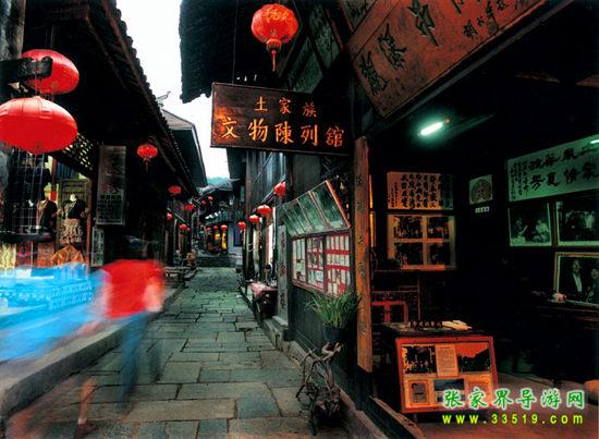拾級(jí)而上,山路一般的陡峭。從碼頭開(kāi)始綿亙而上的石階,那是一條長(zhǎng)達(dá)五里貫穿古鎮(zhèn)的青石板路,它沒(méi)有名字,于是人們就直接管它叫五里長(zhǎng)街。踏上古街,似乎踩在被悠長(zhǎng)歲月遺落的碎片上面。不知不覺(jué)走到掛有“土家觀瀑吊腳樓”牌匾的民俗博物館前,從手搖腳踏的棉花機(jī)、閹豬鳴號(hào)的羊角到世代相傳的雕花牙床,近百件散發(fā)著鄉(xiāng)土氣息的民間用具,展示著土家族古老豐富的歷史。看護(hù)人說(shuō),這是一位土家族年輕人爬山涉水收集來(lái)的,靜靜地訴說(shuō)著這個(gè)小村古老的過(guò)去。這棟三層的小樓,一半落在河岸上,另一半?yún)s是由水泥柱支撐著,水泥柱直插河底,任水流日日夜夜地沖刷,小小的吊腳樓仍穩(wěn)穩(wěn)當(dāng)當(dāng)站在那里,任憑時(shí)間的流逝。好聰明的土家人,巧借一片水面,竟建起了如此妖嬈的住房。