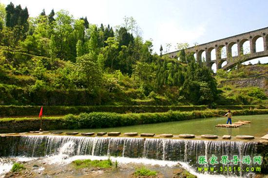 寨前阡陌縱橫,溪流交錯(cuò),九曲迂回,水邊是排排水車(chē)、石碾,水里是整塊整塊的天然青巖板,出水為洲,入水為瀑,并形成許多奇特階梯瀑,水上是一道道巖板堰,堰上是一道道形態(tài)各異的跳巖,水溝上橫著塊塊巨大的巖板橋……山水田園與水車(chē)、水碾、巖板堰、巖板橋、跳巖相互輝映,構(gòu)成一幅幅絕妙畫(huà)卷。