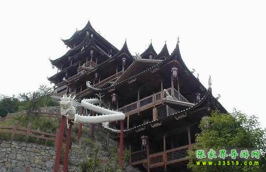 望郎峰北隔幽谷西望,一巨大石壁高聳云端,面寬達百米。因受風雨剝蝕,流痕結網(wǎng),與頂端參差不齊的峰石結合,構成錯落有致的一幅壁畫:林木掩映的圍墻之內(nèi),池塘水榭,墻垣瓦梁,依稀可見。還有幾座吊腳樓,幾座寺廟,其間仿佛有人來往。雨天,云霧飄拂,樓臺墻垣若隱若現(xiàn),儼然海市蜃樓。