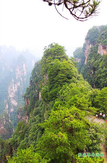 憑欄環(huán)望,諸峰拱立,百態(tài)千姿,近在咫尺。天氣凈朗時(shí)候,山石節(jié)理,松柏古木,依稀可辨。欣賞奇峰高崗,我們或者因?yàn)橹荒苓h(yuǎn)觀,或者因?yàn)樯碓趶]山難識(shí)其真面目,一步登天能夠給你一個(gè)細(xì)細(xì)玩賞的機(jī)會(huì)。回望走過的楊家界,層巒疊嶂,濃淡相宜,眺望,黃獅寨、張家界……若隱若現(xiàn),秀色可餐。
