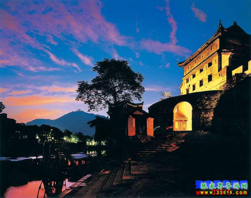 凰山城依偎著沱江,群山環(huán)抱,關(guān)隘雄奇。這里的山不高而秀麗,水不深而澄清,峰嶺相摩、河溪縈回,碧綠的江水從古老的城墻下蜿蜒而過,翠綠的南華山麓倒映江心。江中漁舟游船數(shù)點(diǎn),山間暮鼓晨鐘兼鳴,河畔上的吊腳樓輕煙裊裊,可謂天人合一。