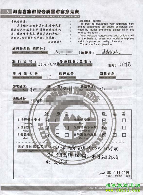 2010年1月27日河南牛先生一行13人旅游接待質量反饋單