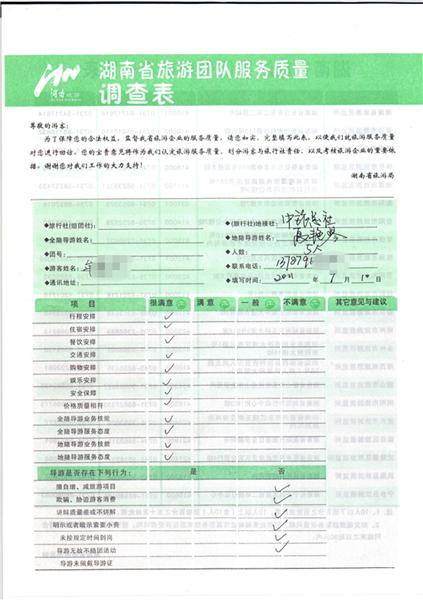 2011年7月10日牟先生一行5人旅游質(zhì)量反饋