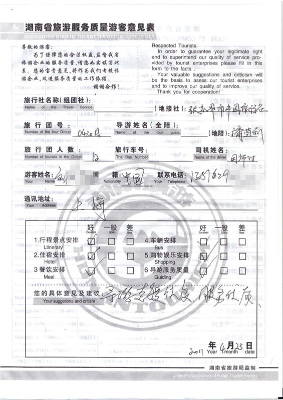 2011年4月23日劉先生旅游質(zhì)量反饋:導游態(tài)度優(yōu)良,服務優(yōu)質(zhì)