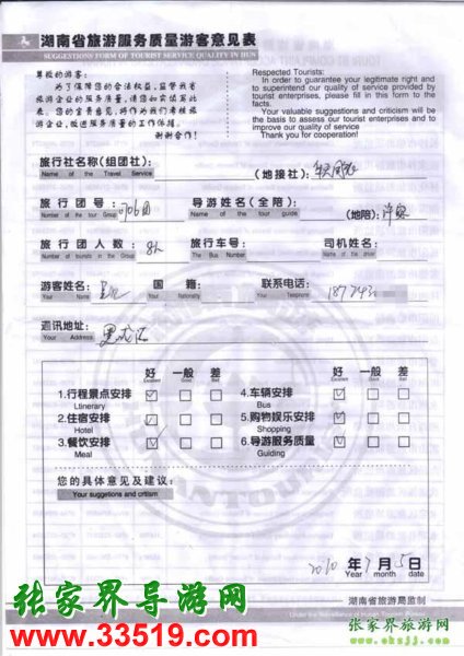 2010年7月5日黑龍江吳先生一行5位旅游質(zhì)量反饋